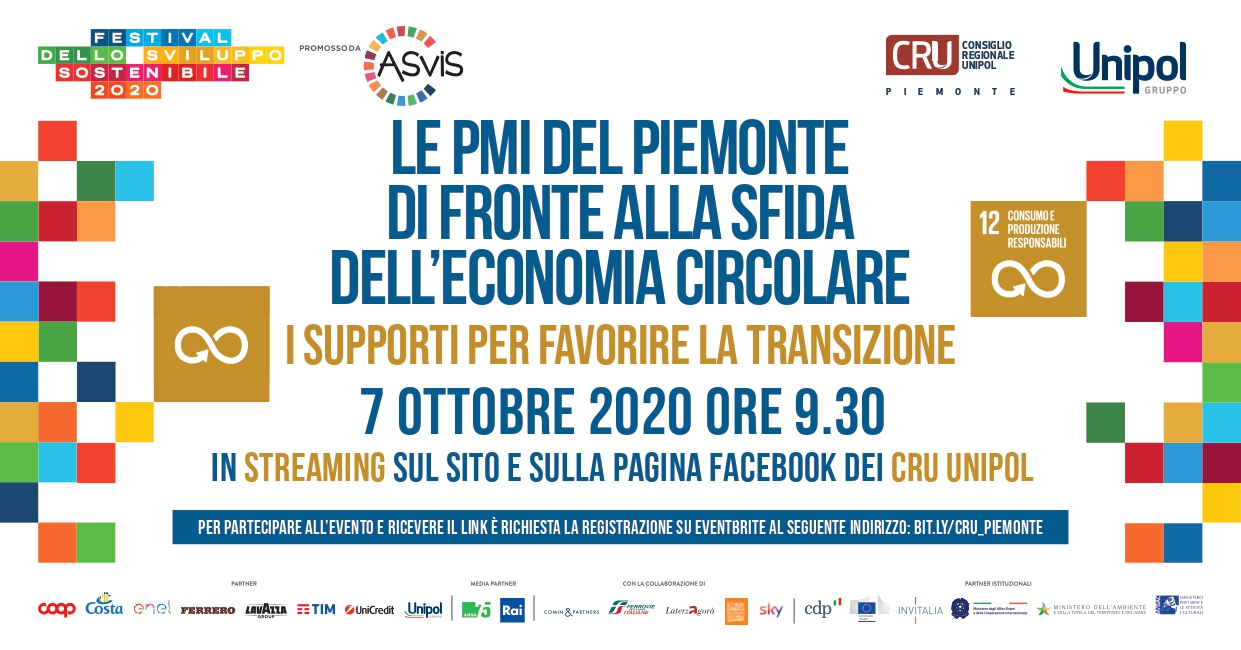 Mercoledì 7 ottobre, alle ore 9.40, si terrà in streaming sui canali web e social di CRU – Consigli Regionali Unipol, il convegno “Le PMI del Piemonte di fronte alla sfida dell’Economia Circolare. I supporti per favorire la transizione”. L’evento si pone all’interno del Festival dello Sviluppo Sostenibile 2020 promosso da ASVIS con lo scopo di richiamare l’attenzione Nazionale e locale sull’importante tema della cultura della sostenibilità per realizzare un cambiamento politico e culturale che permetta all’Italia di rispettare l’Agenda 2030 Onu. L’iniziativa del Consiglio Regionale Unipol Piemonte propone una riflessione sulla governance dei processi e su quali sono le modalità più efficaci per incentivare e accompagnare la transizione delle piccole e medie imprese verso modelli produttivi sempre più sostenibili in coerenza con gli obiettivi dell’Agenda ed in particolare con il Goal 12 “Il consumo e la produzione responsabile”. Adottando un approccio di economia circolare basato sull’analisi del ciclo di vita del prodotto, l’utilizzo più diffuso di “materie prime-seconde”, la riduzione degli scarti e dei rifiuti a fine ciclo, le PMI possono contribuire sensibilmente a ridurre l’impatto ambientale e al tempo stesso trovare nuovi spazi di competitività sui mercati e creare nuove opportunità di lavoro e crescita dell’occupazione. Al fine di favorire una concreta realizzazione di queste trasformazioni, partendo da un’analisi del posizionamento regionale e del contesto normativo, ci si focalizzerà sulle risorse messe a disposizione dalle Istituzioni per le PMI manifatturiere e per le imprese agricole e sulle possibili interconnessioni con il sistema della ricerca universitaria, dei poli di innovazioni e delle società fornitrici di servizi.