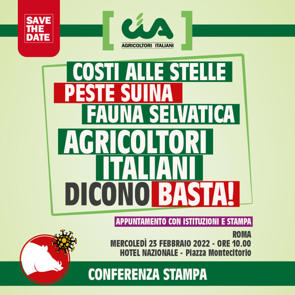 “Costi alle stelle, peste suina, fauna selvatica. Gli Agricoltori Italiani dicono basta!” Questo il monito lanciato da Cia-Agricoltori Italiani che, su questi temi, terrà una conferenza stampa a Roma, domani, mercoledì 23 febbraio, alle ore 10 all’Hotel Nazionale in piazza Montecitorio.